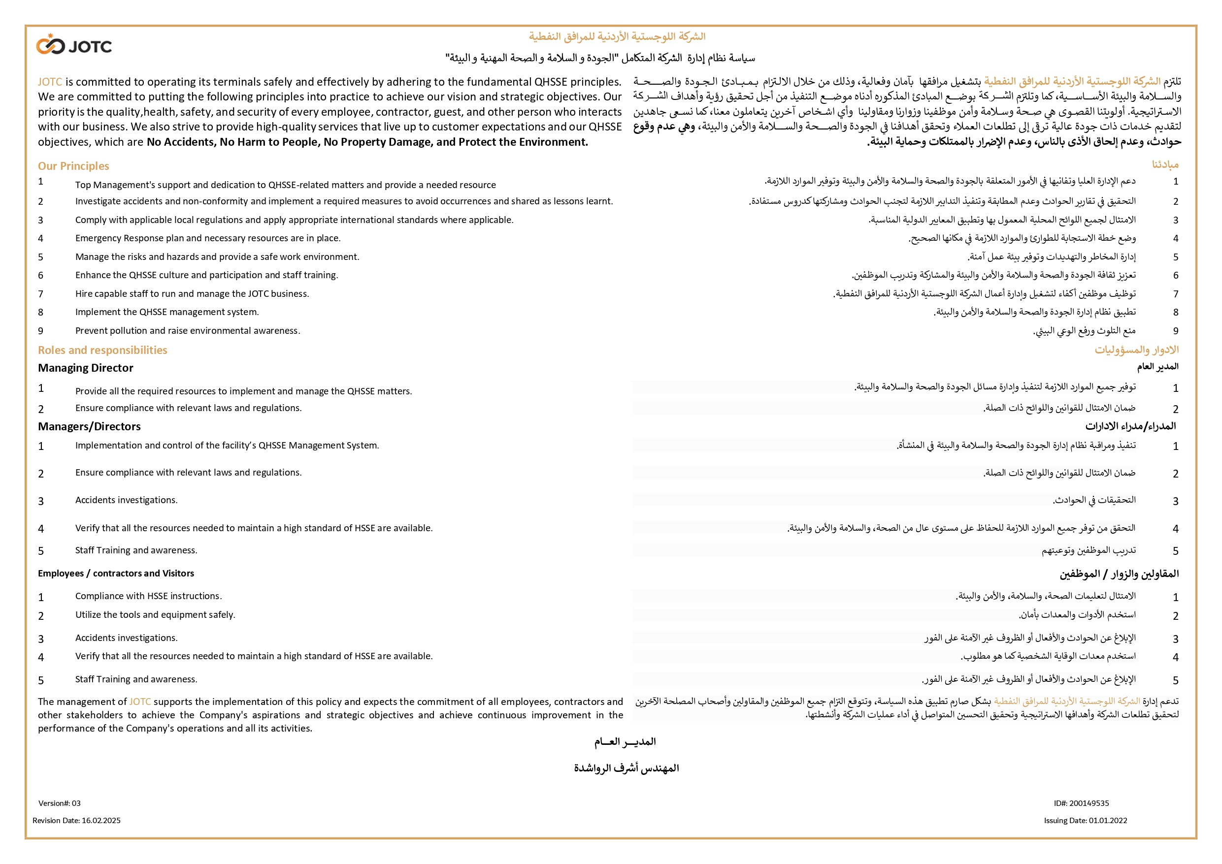 تلتزم جوتك بالمبادئ الاساسية للسلامة والأمن والبيئة والجودة لتشغيل مرافقها بكفاءة وأمان، حيث تعد صحة وسلامة موظفينا وزوارنا ومقاولينا وأي ممن يتعاملون معنا من أهم اولوياتنا الأساسية، حيث أن هدفنا الرئيسي هو منع جميع الحوادث وضمان تطبيق لوائح السلامة والصحة المهنية وحماية البيئة من خلال العناصر التالية: